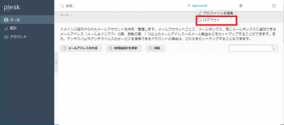home メールサーバー管理画面マニュアル mx42,mx45,mx47,mx48 / ex05,ex07 / ow01~ow03の場合 ログアウト方法 ログアウト方法 操作方法 画面上部にあります 赤枠の部分「loginuser@ドメイン」をクリックしてください。 赤枠の部分「ログアウト」をクリックしていただければ ログアウト処理が完了になります。 ログアウトを行わない場合 上記の操作を行わずブラウザを閉じると、30分間はログイン状態が継続されます。 すぐにログアウトしたい場合はログアウトの操作をお願いいたします。 < 前のページへ 一覧へ戻る