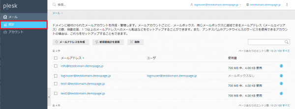 home メールサーバー管理画面マニュアル mx42,mx45,mx47,mx48 / ex05,ex07 / ow01~ow03の場合 統計のページについて 統計のページについて ご案内の前に 下記メールアドレスの作成方法についてはログインが行えた状態からご案内いたしますので ログイン方法が不明な場合は下記のリンクからご確認ください。 ログイン方法について 確認方法 管理画面上部の「統計」タブをクリックすると、お客様のディスクおよびデータ転送量が表示されます。 主要な項目について 【ディスクスペース】 現在ご利用頂ける全体の容量と、 使用中の容量です。 【トラフィック】 当月に転送したデータの総量です。 メールアドレスの一覧画面へ戻る場合 ログイン後管理画面の左側に表示されているメニューから 「メール」をクリックしてください。 その他項目について 「FTP統計」 「データ転送統計」 「ウェブ統計」 上記はクリックはをお控えください。 < 前のページへ 次のページへ > 一覧へ戻る