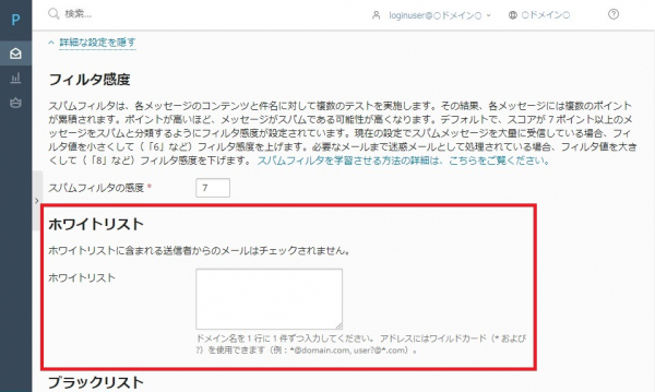 下記の操作方法についてはスパムフィルタ設定の画面を表示した状態から