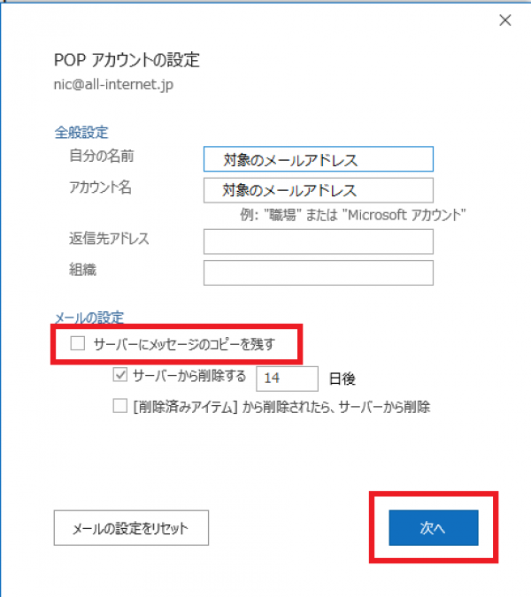3.「詳細」タブの「メッセージ受信後にメッセージのコピーをサーバから削除」にチェックをします。
