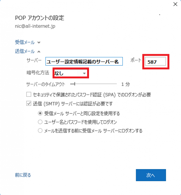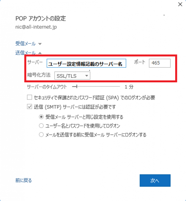 「ユーザー設定情報」記載の送信メールサーバー名
