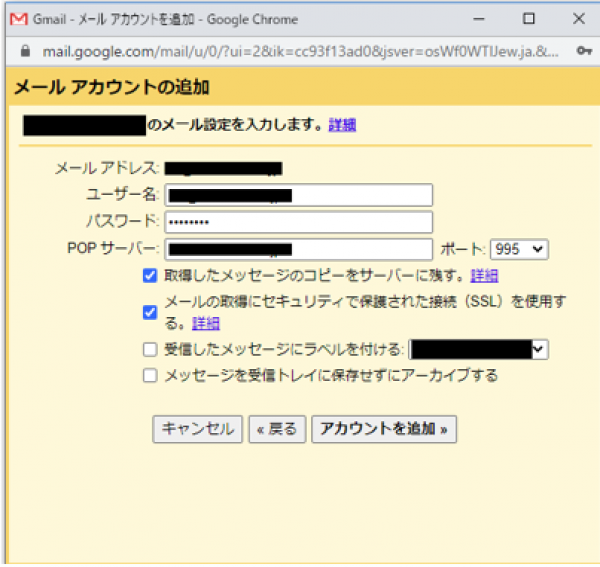 ・メールの取得にセキュリティで保護された接続(SSL)を使用する → チェック入れる