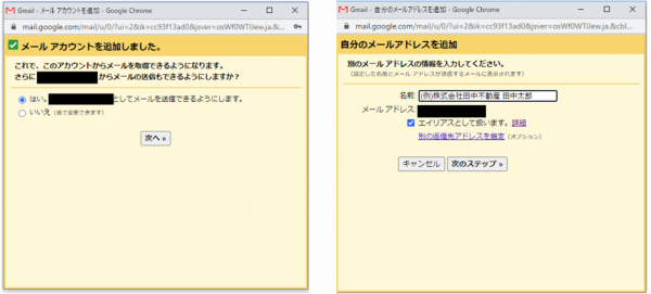 「名前」は送信先に表示される名前なので、例のようにご自由に決めて入れてください。名前を入れましたら「次のステップ」をクリック